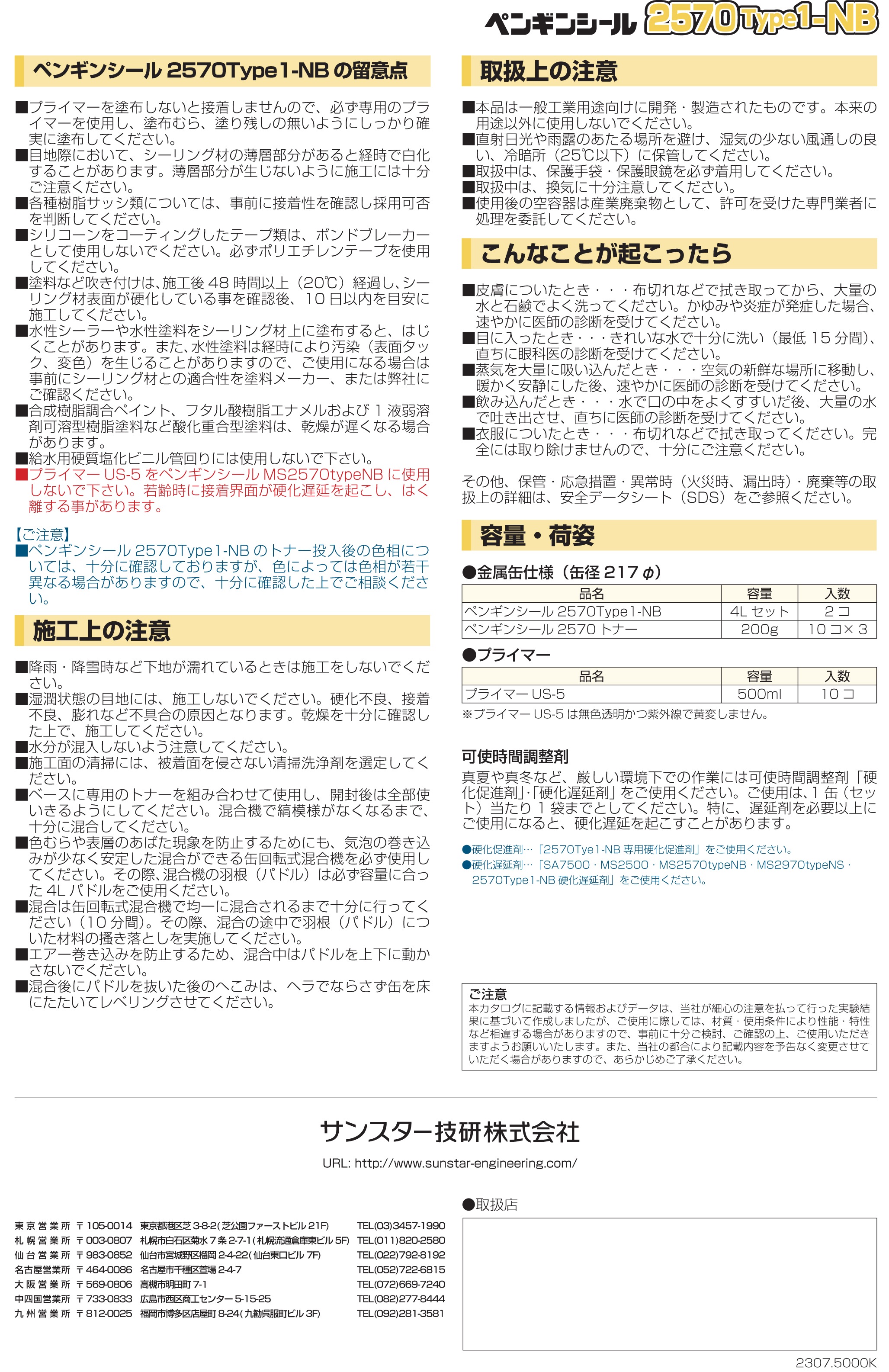 ⇒ペンギンシール共用トナーへ※プライマーUS-5を必ずご使用ください。※専用促進剤 ⇒ペンギンシール2570Type1-NB専用硬化促進剤